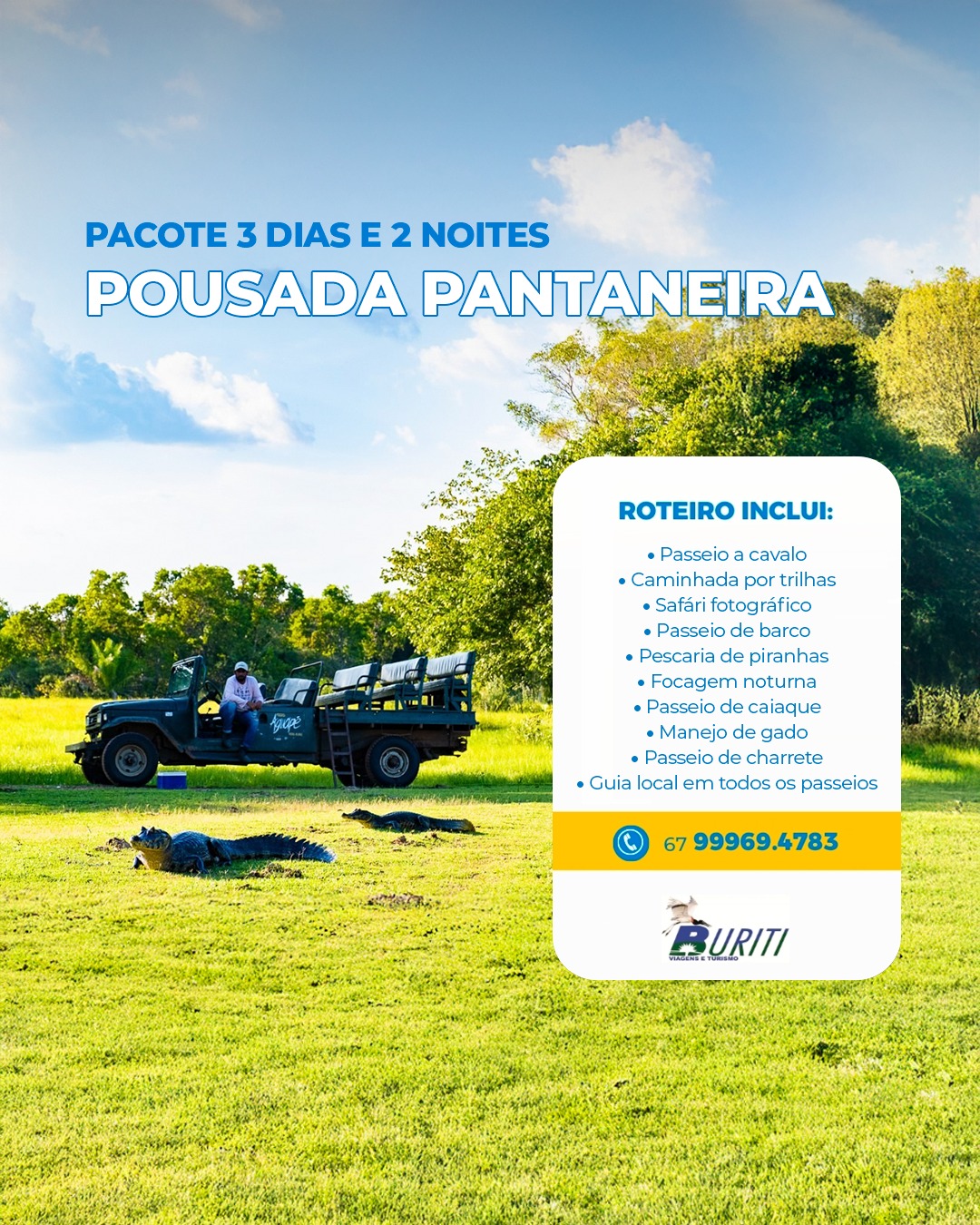 Uma opção perfeita para quem quer aproveitar o melhor do Pantanal em um fim de semana curto, com atividades guiadas e muita natureza.